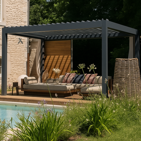 Part of the bioclimatic pergola collection, the APS pergola invites you to slow down and reconnect—with nature, with light, with stillness. Its manually operated blades, capable of rotating up to 120°, need no electricity, allowing you to engage with your environment in the most natural way. By removing the motor, the design embraces simplicity—not just in form, but in feeling—creating a space that is quiet, elegant, and free from distraction. The flat aluminum louvers rest gently above, barely noticeable even when open, allowing sky and structure to blend in perfect harmony.