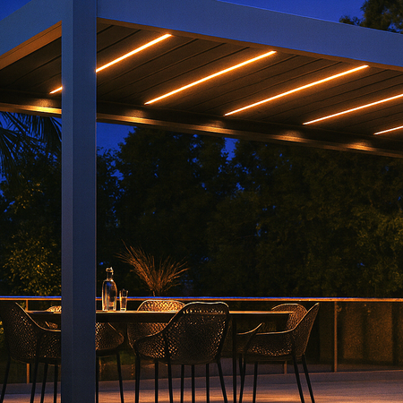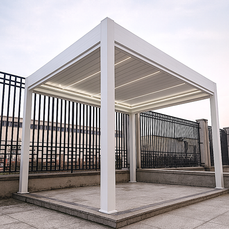 On warm summer days, partially closing the blades and angling them upward reflects harsh sunlight away while inviting in a soft breeze—casting delicate shadows that cool the space and soothe the senses. Open the louvers wide—up to a full 150°—and the roof dissolves into the sky, welcoming sunlight and creating a seamless blend between indoors and out.