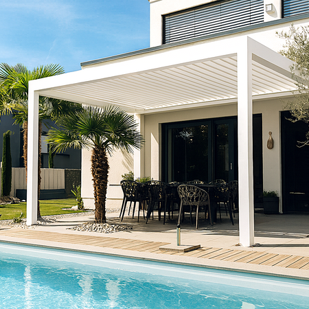 With its sleek, lightweight, and compact design, the APP pergola gracefully unites the precision of modern engineering with the quiet elegance of minimalist architecture. Outfitted with refined, state-of-the-art features—like manually adjustable aluminum louvers—it allows you to shape the atmosphere beneath the pergola to your liking. By gently tilting the blades, you can fine-tune the light and airflow, creating a naturally balanced temperature and a setting that feels both thoughtful and effortless.