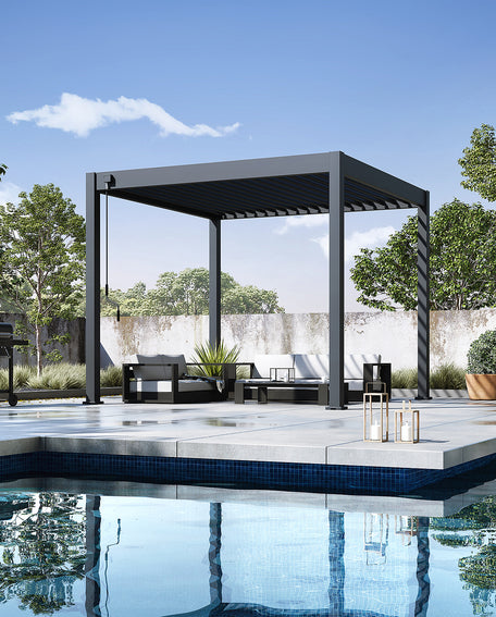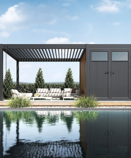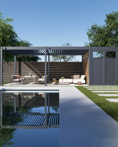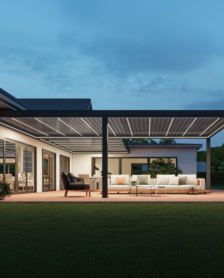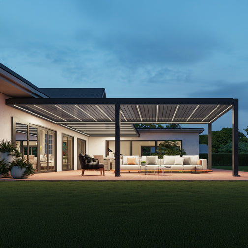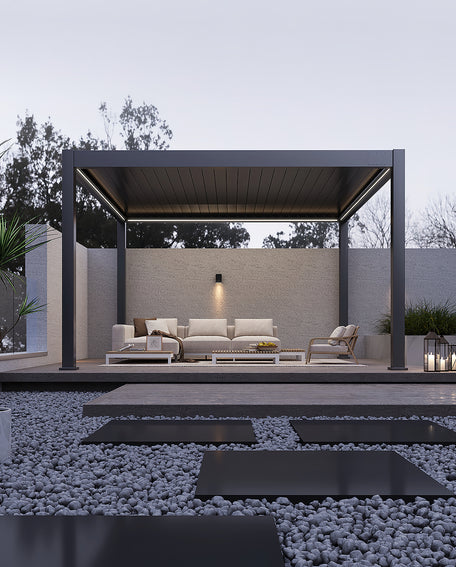 Our modern pergolas and precision-engineered horizontal louvered roof systems are crafted entirely from premium-grade aluminum. Designed to invite light and air when open, and to seal completely when closed,