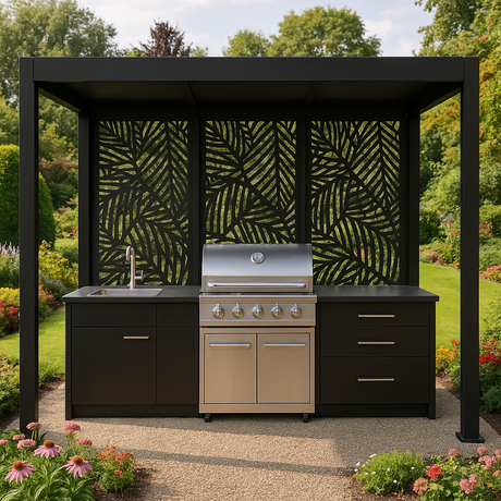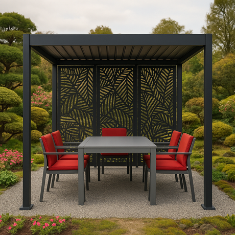 The laser-cut design creates beautiful light and shadow effects while offering seclusion and sun protection.